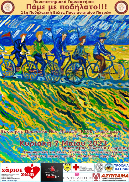 Το Πανεπιστήμιο Πατρών, με την οργανωτική επιμέλεια του Πανεπιστημιακού Γυμναστηρίου και τη σύμπραξη της Επιτροπής Αθλητισμού του Πανεπιστημίου Πατρών, διοργανώνει την θεσμοθετημένη πλέον 11η Ποδηλατική Βόλτα 2023 με τίτλο «Πάμε με Ποδήλατο».