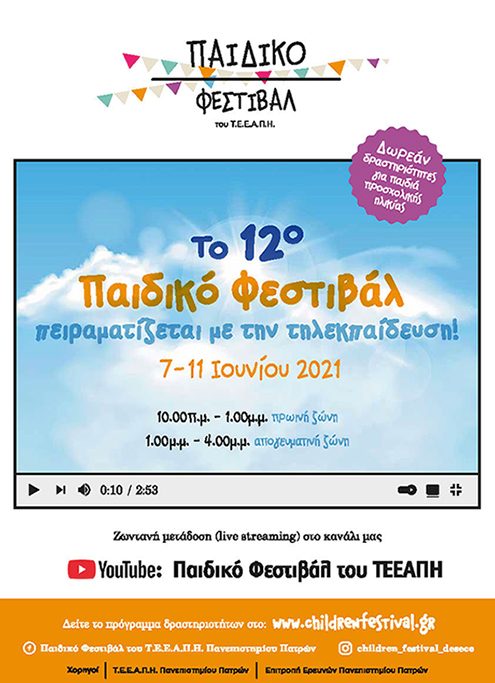 Οι φοιτήτριες και οι φοιτητές του Τμήματος Επιστημών της Εκπαίδευσης και της Αγωγής στην Προσχολική Ηλικία (Τ.Ε.Ε.Α.Π.Η.) του Πανεπιστημίου Πατρών “πειραματίζονται” με την τηλεκπαίδευση στο πλαίσιο του 12ου Παιδικού Φεστιβάλ του Τ.Ε.Ε.Α.Π.Η.