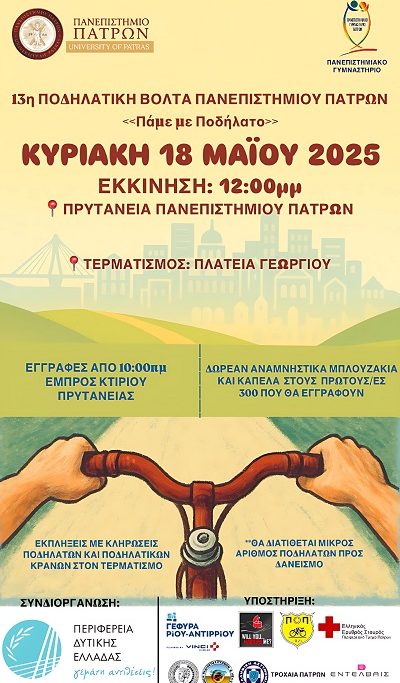 Το Πανεπιστήμιο Πατρών, σε συνεργασία με την Περιφέρεια Δυτικής Ελλάδας-Αντιπεριφερειάρχη Αθλητισμού, τη σύμπραξη της Επιτροπής Αθλητισμού του Πανεπιστημίου Πατρών, τους υποστηρικτές της δράσης και την οργανωτική επιμέλεια του Πανεπιστημιακού Γυμναστηρίου, διοργανώνει για μία ακόμα χρονιά τη 13η Ποδηλατική Βόλτα 2025 με τίτλο «Πάμε με Ποδήλατο».