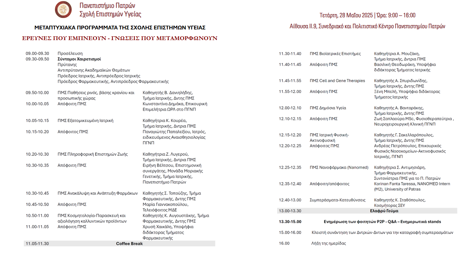 Την Τετάρτη 28 Μαΐου 2025 και ώρα 9.00-16.00 στην αίθουσα ΙΙ.9 του Συνεδριακού και Πολιτιστικού Κέντρου του Πανεπιστημίου Πατρών, η Κοσμητεία της Σχολής Επιστημών Υγείας σε συνεργασία με τα Τμήματα Ιατρικής και Φαρμακευτικής και τους Διευθυντές των Προγραμμάτων Μεταπτυχιακών Σπουδών των δυο Τμημάτων, διοργανώνει ενημερωτική Ημερίδα για τα Προγράμματα Μεταπτυχιακών Σπουδών της Σχολής Επιστημών Υγείας.