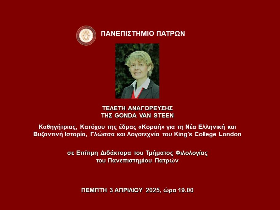 στο King’s College London θα αναγορευθεί Επίτιμη Διδάκτορας του Τμήματος Φιλολογίας του Πανεπιστημίου Πατρών, την Πέμπτη 3 Απριλίου 2025 και ώρα 19:00 στην Αίθουσα Τελετών «Οδυσσέας Ελύτης». Το έργο και την προσωπικότητα της τιμώμενης θα παρουσιάσει η Καθηγήτρια Ευφημία Καρακάντζα, Πρόεδρος του Τμήματος Φιλολογίας, ενώ θα ακολουθήσει η αναγόρευση της τιμώμενης σε Επίτιμη Διδάκτορα του Τμήματος Φιλολογίας από την Πρόεδρο του Τμήματος. Η περιένδυση της τιμώμενης θα πραγματοποιηθεί από τον Πρύτανη του Πανεπιστημίου, Καθηγητή Χρήστο Μπούρα. Η εκδήλωση της επιτιμοποίησης θα ολοκληρωθεί με την ομιλία της Καθηγήτριας Gonda Van Steen με τίτλο: «Όταν η έρευνα γίνεται δράση και αντίδραση: Ανεπιθύμητα παιδιά τότε, στελέχη της διασποράς σήμερα»
