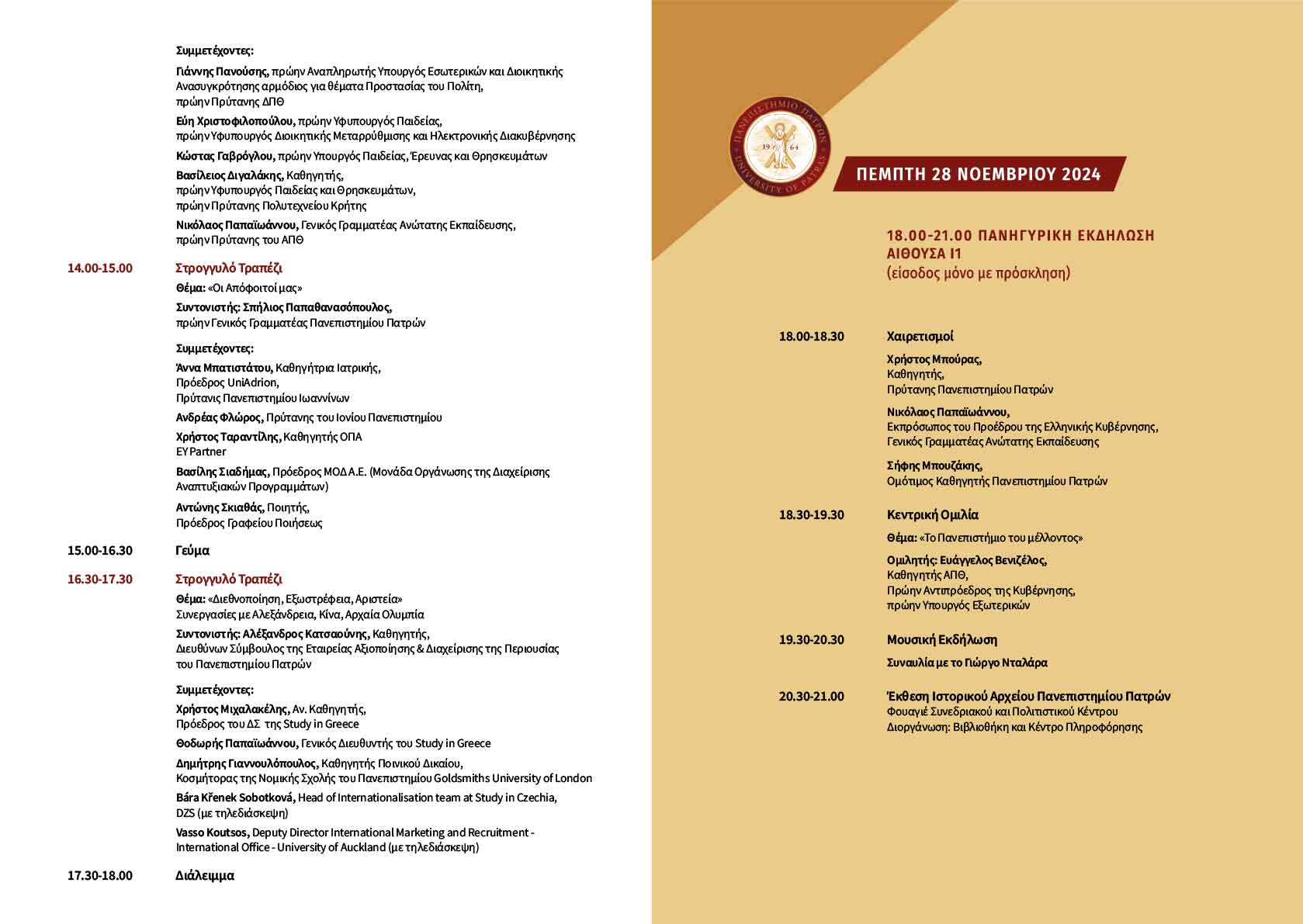 Πρόγραμμα Επετειακού Συνεδρίου 60 Χρόνια Πανεπιστήμιο Πατρών 28-29 Νοεμβρίου 2024, Εξώφυλλα Πρόγραμμα Επετειακού Συνεδρίου 60 Χρόνια Πανεπιστήμιο Πατρών 28-29 Νοεμβρίου 2024, Σελίδες 2-3 Πρόγραμμα Επετειακού Συνεδρίου 60 Χρόνια Πανεπιστήμιο Πατρών 28-29 Νοεμβρίου 2024, Σελίδες 4-5 Πρόγραμμα Επετειακού Συνεδρίου 60 Χρόνια Πανεπιστήμιο Πατρών 28-29 Νοεμβρίου 2024, Σελίδες 6-7
