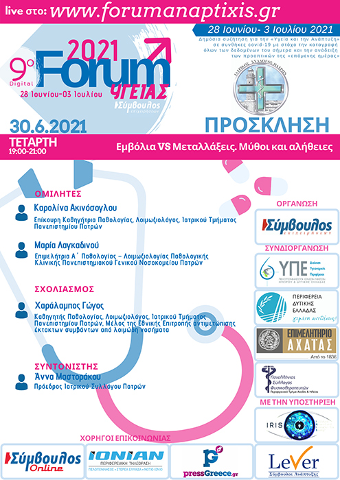 To 9o Forum Υγείας 2021 θα διοργανωθεί για μια ακόμη χρονιά σε digital μορφή το διάστημα 28 Ιουνίου -3 Ιουλίου 2021 και οι ενδιαφερόμενοι μπορούν να το παρακολουθήσουν ελεύθερα στο forumanaptixis.gr