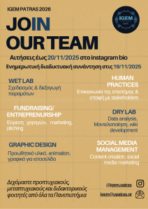 Η ομάδα iGEM Patras του Πανεπιστημίου Πατρών ξεκινά τη διαδικασία επιλογής νέων μελών για το φετινό διαγωνιστικό έτος και καλεί προπτυχιακούς, μεταπτυχιακούς και διδακτορικούς φοιτητές από όλα τα