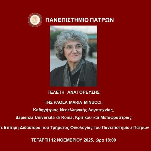 12.11.2025 | Τελετή Αναγόρευσης της Paola Maria Minucci, Καθηγήτριας Νεοελληνικής Λογοτεχνίας, Sapienza Università di Roma, Kριτικού και Mεταφράστριας σε Επίτιμη Διδάκτορα του Τμήματος Φιλολογίας του Πανεπιστημίου Πατρών