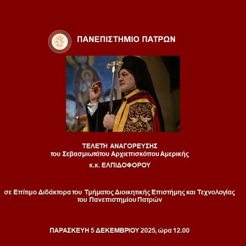 Τελετή Αναγόρευσης του Σεβασμιωτάτου Αρχιεπισκόπου Αμερικής κ.κ. Ελπιδοφόρου σε Επίτιμο Διδάκτορα | 5.12.2025 και ώρα: 12.00μ.| Αίθουσα Τελετών “Οδυσσέας Ελύτης”