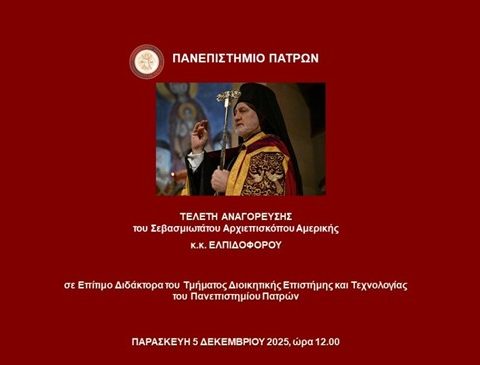 Πανεπιστήμιο Πατρών – Τελετή Αναγόρευσης του Σεβασμιωτάτου Αρχιεπισκόπου Αμερικής κ.κ. Ελπιδοφόρου | 5.12.2025
