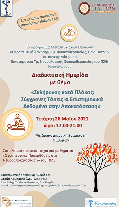 Στα πλαίσια εορτασμού της Παγκόσμιας Ημέρας Σκλήρυνσης κατά Πλάκας, το ΠΜΣ «Θεραπευτική Άσκηση», του Τμήματος Φυσικοθεραπείας, του Πανεπιστημίου Πατρών και το Επιστημονικό Τμήμα Νευρολογικής Φυσικοθεραπείας του Πανελληνίου Συλλόγου Φυσικοθεραπευτών (ΠΣΦ) συνδιοργανώνουν διαδικτυακή επιστημονική εκδήλωση με θέμα