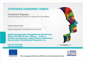 Στο πλαίσιο της Πράξης «Γραφείο Διασύνδεσης Πανεπιστημίου Πατρών», το Τμήμα Απασχόλησης, Σταδιοδρομίας και Διασύνδεσης, της Διεύθυνσης Εκπαίδευσης και Έρευνας, θα υλοποιήσει διαδικτυακό Εργαστήριο Επαγγελματικής Ενδυνάμωσης, την Πέμπτη 19 Μαΐου 2022 και ώρα 12:00 μ.μ. – 14:00 μ.μ., με θέμα: “Οριζόντιες Δεξιότητες: 1) ικανότητα συνεργασίας σε ομάδα, 2) λήψη αποφάσεων σε περίπλοκα περιβάλλοντα, 3) επίλυση προβλημάτων και συγκρούσεων, 4) κριτική σκέψη, 5) συναισθηματική νοημοσύνη και ενσυναίσθηση, 6) ανάληψη πρωτοβουλιών, 7) οργανωτικότητα, 8) διαχείριση χρόνου,