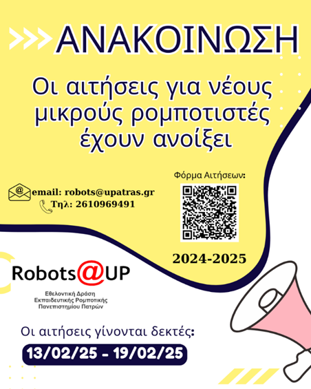 Η εθελοντική δράση εκπαιδευτικής ρομποτικής του Πανεπιστημίου Πατρών, Robots@UP, για ακόμη μία χρονιά, ανοίγει τις πόρτες της για να υποδεχθεί νέους μικρούς ρομποτιστές, που θα ενταχθούν και θα ακολουθήσουν το πρωτοποριακό πρόγραμμά της στον μαγικό κόσμο της εκπαιδευτικής ρομποτικής και του STEAM (Science, Technology, Engineering, Art and Mathematics).