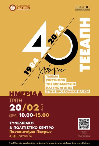 Το Τμήμα Επιστημών της Εκπαίδευσης και της Αγωγής στην Προσχολική Ηλικία (ΤΕΕΑΠΗ) οργανώνει Ημερίδα για τα 40 χρόνια λειτουργίας του, την Τρίτη 20 Φεβρουαρίου 2024 (10.00 – 15.00) στο Αμφιθέατρο Ι-4 του Συνεδριακού και Πολιτιστικού Κέντρου του Πανεπιστημίου Πατρών. Το Τμήμα Επιστημών της Εκπαίδευσης και της Αγωγής στην Προσχολική Ηλικία (ΤΕΕΑΠΗ) δέχθηκε για πρώτη φορά φοιτητές/τριες τον Σεπτέμβριο του 1984. Αναλυτικά το πρόγραμμα της ημερίδας: pdf