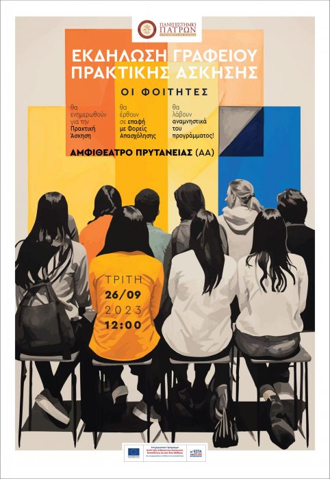 Εν όψει λήξης της Πράξης “Πρακτική Άσκηση τριτοβάθμιας εκπαίδευσης Πανεπιστημίου Πατρών για το ακαδημαϊκό έτος 2022-2023” (MIS) 5181130, το Γραφείο Πρακτικής Άσκησης του Ιδρύματος προχωρά στη διοργάνωση εκδήλωσης – στο πλαίσιο των υποχρεώσεων του (παρουσίαση αποτελεσμάτων του έργου), για το έργο με τίτλο “Πρακτική Άσκηση Τριτοβάθμιας Εκπαίδευσης του Πανεπιστημίου Πατρών 2022-2023”, η οποία θα πραγματοποιηθεί την Τρίτη 26 Σεπτεμβρίου 2023 και ώρα 12.00, στο Κεντρικό αμφιθέατρο της Πρυτανείας του Παν. Πατρών.