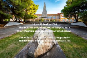 Για Τέταρτη συνεχόμενη χρονιά το Τμήμα Υποστήριξης Φοιτητών, Απασχόλησης, Σταδιοδρομίας και Διασύνδεσης, της Διεύθυνσης Εκπαίδευσης και Έρευνας, διοργανώνει διαδικτυακή ενημερωτική εκδήλωση στις 16 και 17 Μαΐου 2024, για μαθητές Γ΄ Λυκείου με θέμα: «Οι σπουδές στο Πανεπιστήμιο Πατρών και η επαγγελματική αποκατάσταση των αποφοίτων».