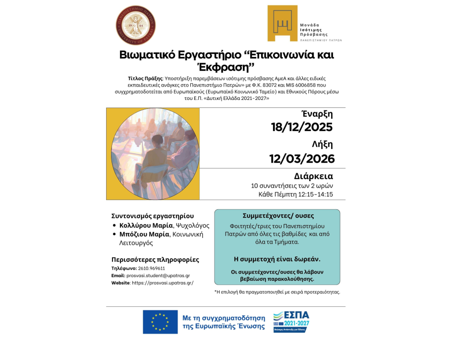 Η Μονάδα Ισότιμης Πρόσβασης της Διεύθυνσης Φοιτητικής Μέριμνας του Πανεπιστημίου Πατρών στο πλαίσιο της Πράξης: «Υποστήριξη παρεμβάσεων ισότιμης πρόσβασης ΑμεΑ και άλλες ειδικές εκπαιδευτικές ανάγκες στο Πανεπιστήμιο Πατρών» με Φ.Κ. 83072 και MIS 6006858 που συγχρηματοδοτείται από Ευρωπαϊκούς (Ευρωπαϊκό Κοινωνικό Ταμείο) και Εθνικούς Πόρους μέσω του Ε.Π. «Δυτική Ελλάδα 2021-2027», με Επιστημονική Υπεύθυνη την Αξιότιμη Αντιπρύτανι Φοιτητικής Μέριμνας και Πολιτισμού κα. Ελ. Αλμπάνη, διοργανώνει την Πέμπτη 18 Δεκεμβρίου 2025 Βιωματικό Εργαστήριο με τίτλο «Επικοινωνία και Έκφραση».