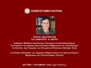 Τέλος, η εκδήλωση της επιτιμοποίησης θα ολοκληρωθεί με την ομιλία του Δημητρίου Ν. Μαύρη με τίτλο: «The Progression towards Advanced Systems Design Methods: My Academic Journey». Περισσότερα: https://www.upatras.edu.gr/teleti-anagorefsis-tou-dimitriou-n-mavri-kathigiti-tou-technologikou-institoutou-tis-georgias-ton-inomenon-politeion-se-epitimo-didaktora-tou-tmimatos-michanologon-kai-aeronafpigon-michanikon/