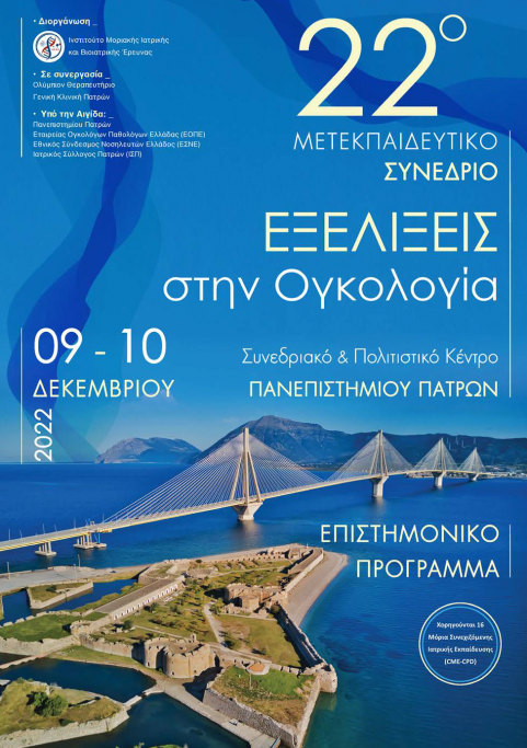 Το 22ο Μετεκπαιδευτικό Συνέδριο με θέμα: “Εξελίξεις στην Ογκολογία”, που διοργανώνεται από το Ινστιτούτο Μοριακής Ιατρικής και Βιοϊατρικής Έρευνας σε συνεργασία με το Ογκολογικό Τμήμα του Ολύμπιου Θεραπευτήριου-Γενικής Κλινικής Πατρών και υπό την αιγίδα του Πανεπιστημίου Πατρών, της Εταιρείας Ογκολόγων Παθολόγων Ελλάδας (ΕΟΠΕ), του Εθνικού Συνδέσμου Νοσηλευτών Ελλάδας (ΕΣΝΕ) και του Ιατρικού Συλλόγου Πατρών, θα διεξαχθεί στις 09 και 10 Δεκεμβρίου 2022, στο Συνεδριακό & Πολιτιστικό Κέντρο του Πανεπιστημίου Πατρών.