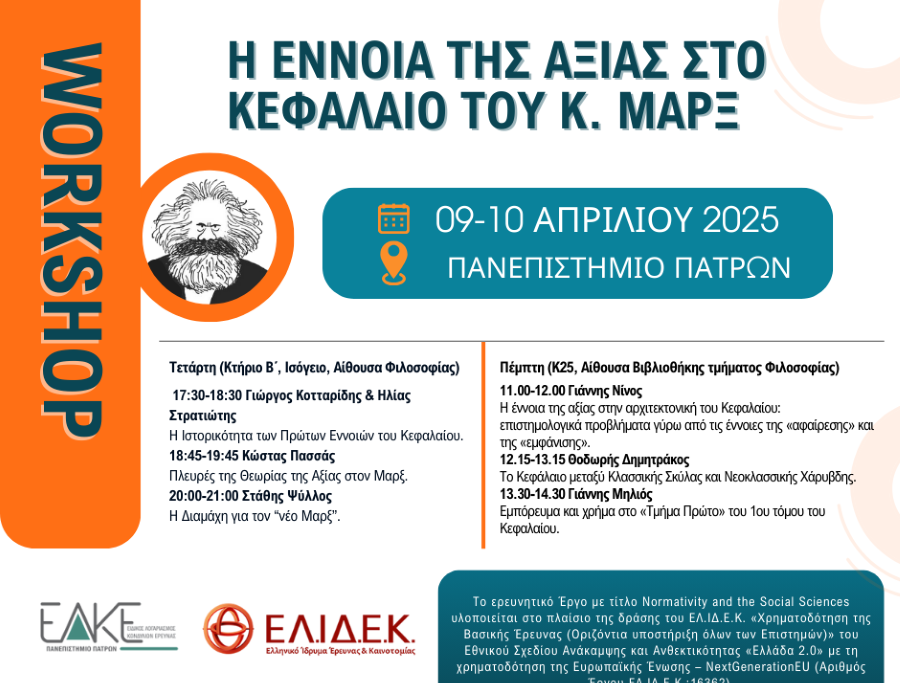 Στις 9 και 10 Απριλίου, θα λάβει χώρα στο Πανεπιστήμιο Πατρών workshop με τίτλο: H Έννοια της Αξίας στο Κεφάλαιο του Κ. Μαρξ.