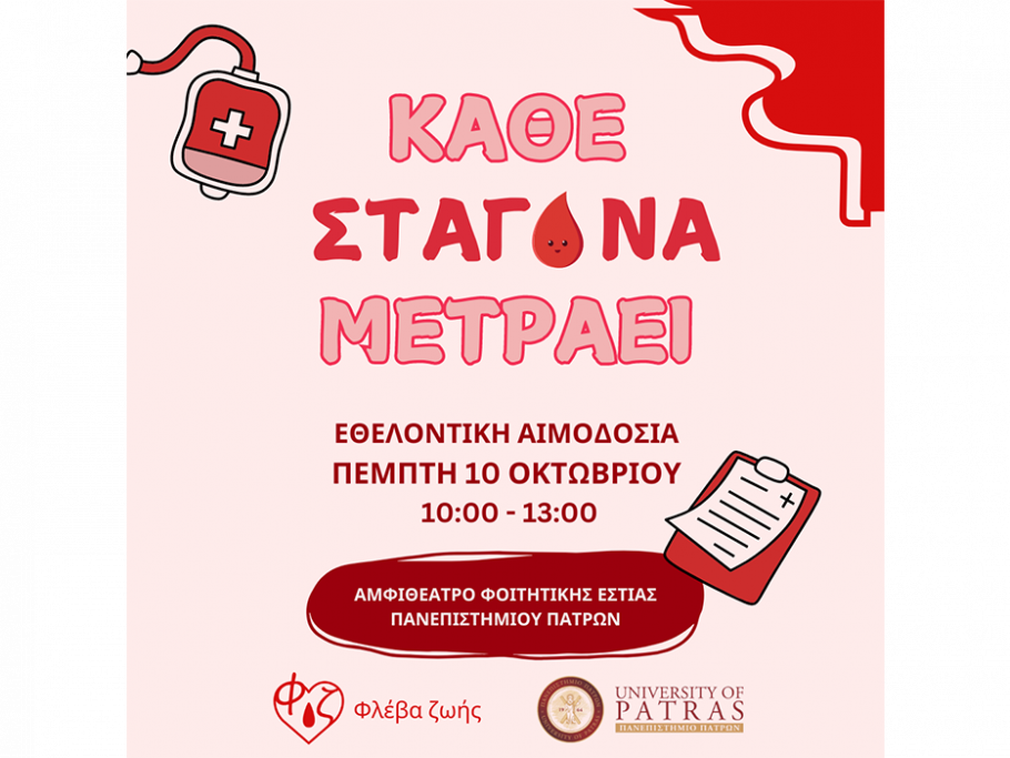 Έχετε την επιλογή, μέσω του Πανεπιστημίου Πατρών και της εθελοντικής ομάδας “Φλέβα Ζωής”, την Πέμπτη 10 Οκτωβρίου 2024 και ώρα 10:00-13:00 στον χώρο του αμφιθεάτρου της φοιτητικής εστίας του Πανεπιστημίου να γίνετε εθελοντές αιμοδότες και να βοηθήσετε τους συνανθρώπους μας, με μοναδικό κόστος λίγα λεπτά από τον χρόνο σας.