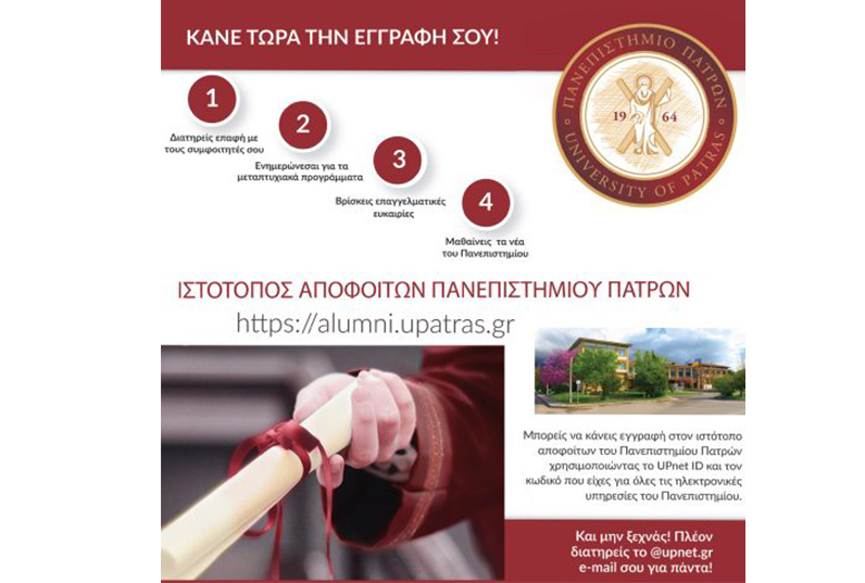 Με μεγάλη χαρά σας περιμένουμε να εγγραφείτε εδώ https://alumni.upatras.edu.gr/register/ αποκτώντας πρόσβαση στο κοινωνικό δίκτυο αποφοίτων μέσω του οποίου σας δίνετε η δυνατότητα να διατηρήσετε επαφή με τους συμφοιτητές σας, να ενημερώνεστε για τα νέα του Πανεπιστημίου, μεταπτυχιακά προγράμματα σπουδών, θέσεις εργασίας, καθώς και για διακρίσεις – βραβεύσεις αποφοίτων του Ιδρύματος.