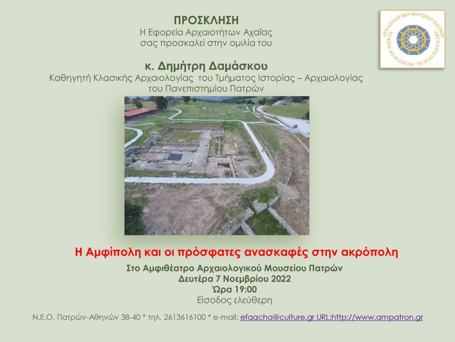 Η Εφορεία Αρχαιοτήτων Αχαϊας σας προσκαλεί στην ομιλία του Καθηγητή Δημήτρη Δαμάσκου με θέμα “Η Αμφίπολη και οι πρόσφατες ανασκαφές στην ακρόπολη” τη Δευτέρα 7 Νοεμβρίου στις 7 μμ. στο Αμφιθέατρο του Αρχαιολογικού Μουσείου Πατρών.