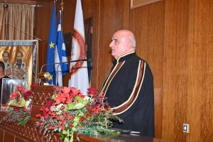 «Σεβασμιώτατε, η πανεπιστημιακή μας κοινότητα σας υποδέχεται με ιδιαίτερο σεβασμό και εκτίμηση. Με τη σημερινή τελετή τιμούμε έναν διακεκριμένο ιεράρχη, έναν θεολόγο και πανεπιστημιακό διδάσκαλο, ο οποίος έχει αφιερώσει τη ζωή του στη διακονία της Εκκλησίας, της γνώσης και στην προαγωγή της ανθρώπινης αξιοπρέπειας. Η παρουσία σας ανάμεσά μας υπενθυμίζει ότι η γνώση, όταν συνοδεύεται από προσήνεια, πνευματικότητα και κοινωνική ευαισθησία, δύναται να λειτουργήσει ως καταλύτης προόδου και δημιουργικής συνεισφοράς. Η αναγόρευσή σας σε Επίτιμο Διδάκτορα του Τμήματος Διοικητικής Επιστήμης και Τεχνολογίας αποτελεί αναγνώριση της συμβολής σας στην προώθηση της προσφοράς, του διαλόγου, της γνώσης και της οικουμενικότητας – θεμελιωδών αξιών που διέπουν το ακαδημαϊκό μας έργο.»
