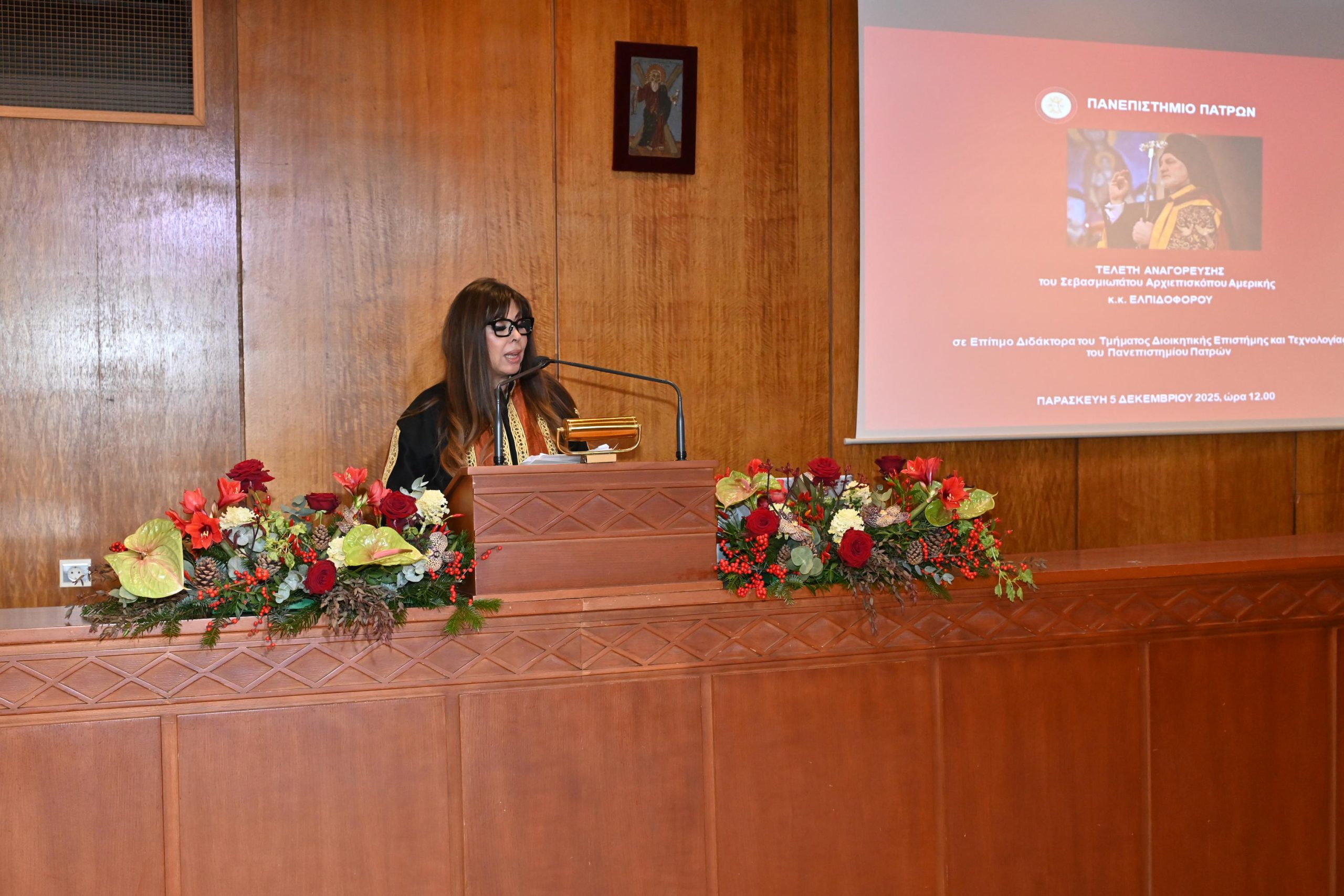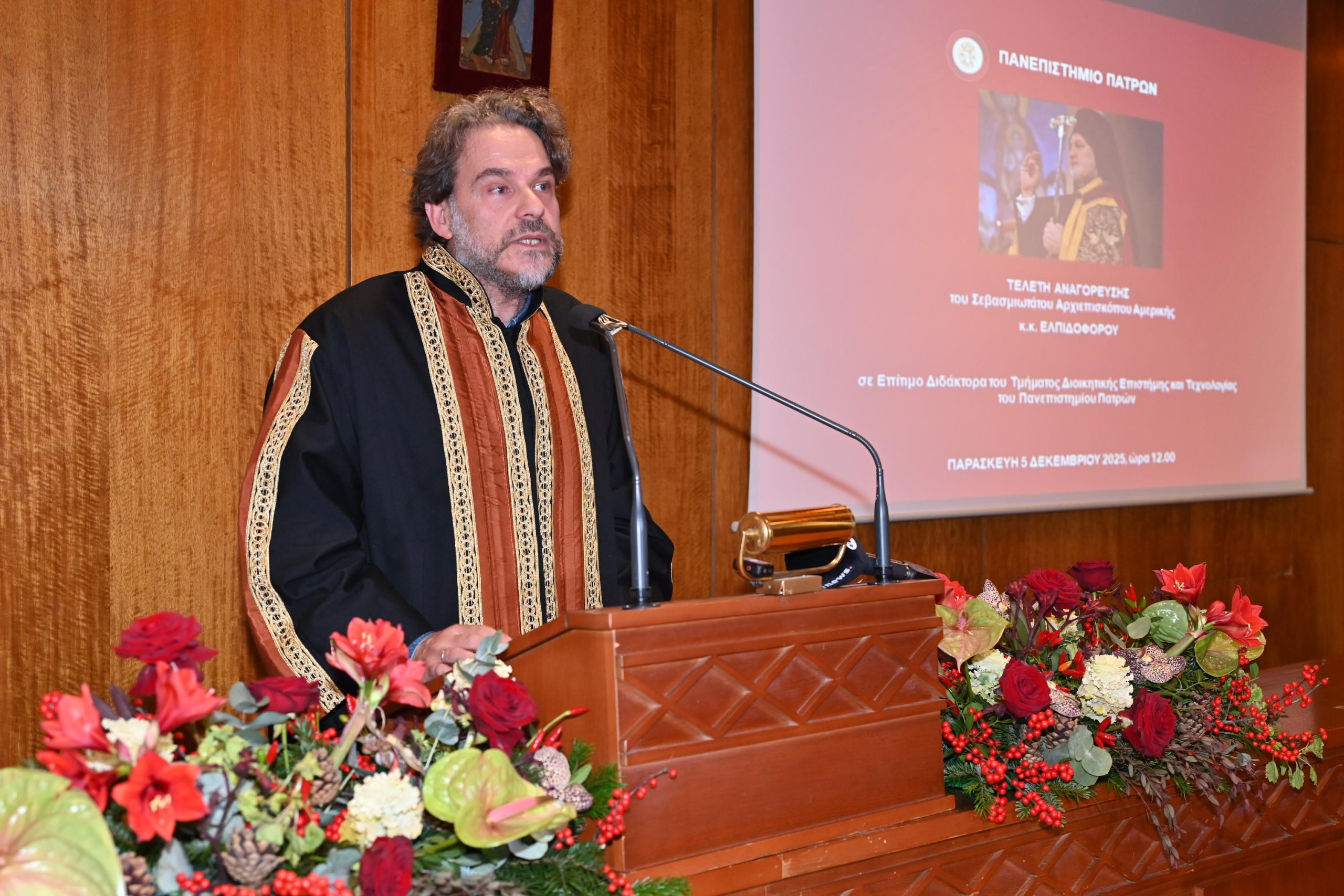 Στην κατάμεστη Αίθουσα Τελετών «Οδυσσέας Ελύτης» του Πανεπιστημίου Πατρών πραγματοποιήθηκε την Παρασκευή 5 Δεκεμβρίου 2025, η τελετή αναγόρευσης του Σεβασμιωτάτου Αρχιεπισκόπου Αμερικής κ.κ. Ελπιδοφόρου σε Επίτιμο Διδάκτορα του Τμήματος Διοικητικής Επιστήμης και Τεχνολογίας. Η εκδήλωση αποτέλεσε κορυφαία ακαδημαϊκή στιγμή για την πανεπιστημιακή κοινότητα, καθώς αναγνωρίστηκε η πνευματική, κοινωνική και επιστημονική συμβολή του τιμώμενου ιεράρχη.