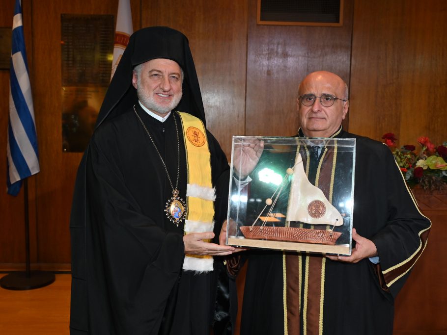 «Σεβασμιώτατε, η πανεπιστημιακή μας κοινότητα σας υποδέχεται με ιδιαίτερο σεβασμό και εκτίμηση. Με τη σημερινή τελετή τιμούμε έναν διακεκριμένο ιεράρχη, έναν θεολόγο και πανεπιστημιακό διδάσκαλο, ο οποίος έχει αφιερώσει τη ζωή του στη διακονία της Εκκλησίας, της γνώσης και στην προαγωγή της ανθρώπινης αξιοπρέπειας. Η παρουσία σας ανάμεσά μας υπενθυμίζει ότι η γνώση, όταν συνοδεύεται από προσήνεια, πνευματικότητα και κοινωνική ευαισθησία, δύναται να λειτουργήσει ως καταλύτης προόδου και δημιουργικής συνεισφοράς. Η αναγόρευσή σας σε Επίτιμο Διδάκτορα του Τμήματος Διοικητικής Επιστήμης και Τεχνολογίας αποτελεί αναγνώριση της συμβολής σας στην προώθηση της προσφοράς, του διαλόγου, της γνώσης και της οικουμενικότητας – θεμελιωδών αξιών που διέπουν το ακαδημαϊκό μας έργο.»