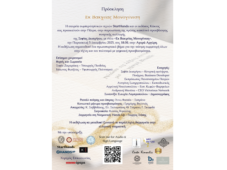 Με αφορμή την Παγκόσμια ημέρα ατόμων με αναπηρία, η εταιρεία συμπεριληπτικών τεχνών Starthands και οι εκδόσεις Κάκτος παρουσιάζουν στην Πάτρα την ποιητική συλλογή της Σοφίας Δευτερίγου με τίτλο «Εκ Βακχείας Μονογένεση» η συμπεριληπτική, την Παρασκευή 5 Δεκεμβρίου, στις 18:30, στην Αγορά Αργύρη.Την εκδήλωση θα χαιρετίσουν πολιτικά και θεσμικά πρόσωπα, εκπρόσωποι οργανισμών και ωφελούμενων μελών, μεταξύ των οποίων, η Υπουργός Παιδείας Σοφία Ζαχαράκη και ο Υφυπουργός Πολιτισμού Ιάσωνας Φωτήλας.