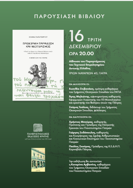Σας προσκαλούμε στην παρουσίαση του βιβλίου της Αν. Καθηγήτριας του Τμήματος Θεατρικών Σπουδών Ιωάννας Παπαγεωργίου «Προφορική παράδοση και νεοτερισμός. Η δομή των έργων του ελληνικού θεάτρου σκιών κατά την περίοδο του Μεσοπολέμου. Η περίπτωση της Πάτρας».