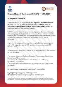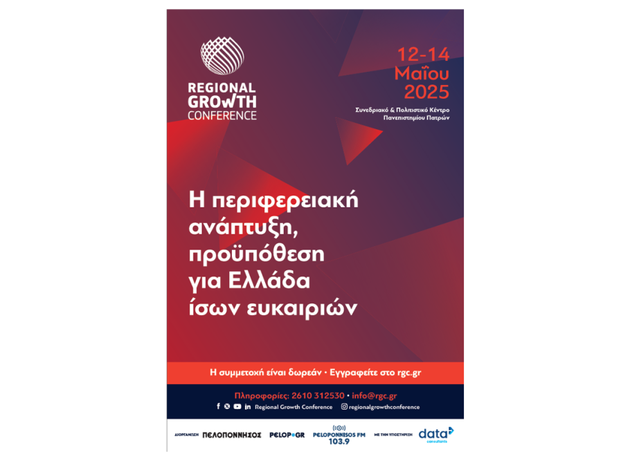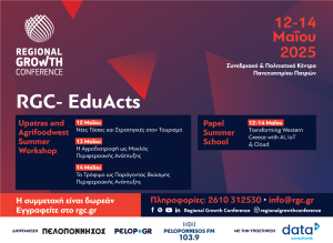 Σας προσκαλούμε να συμμετάσχετε στο Regional Growth Conference 2025 (RGC 2025), το οποίο θα διεξαχθεί 12 – 14 Μαΐου 2025 στο Συνεδριακό και Πολιτιστικό Κέντρο του Πανεπιστημίου Πατρών, με συνδιοργανωτή το Πανεπιστήμιο Πατρών.