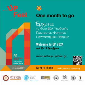 Ένας μήνας έμεινε για την έναρξη του Welcome to Up 2024, του μεγάλου και πρωτοπόρου Φεστιβάλ Υποδοχής Πρωτοετών Φοιτητών του Πανεπιστημίου Πατρών, και οι ετοιμασίες γίνονται με πυρετώδεις ρυθμούς με επίκεντρο την Πανεπιστημιούπολη στο Ρίο και το μεγάλο φοιτητικό χωριό στο πάρκο της Ειρήνης.