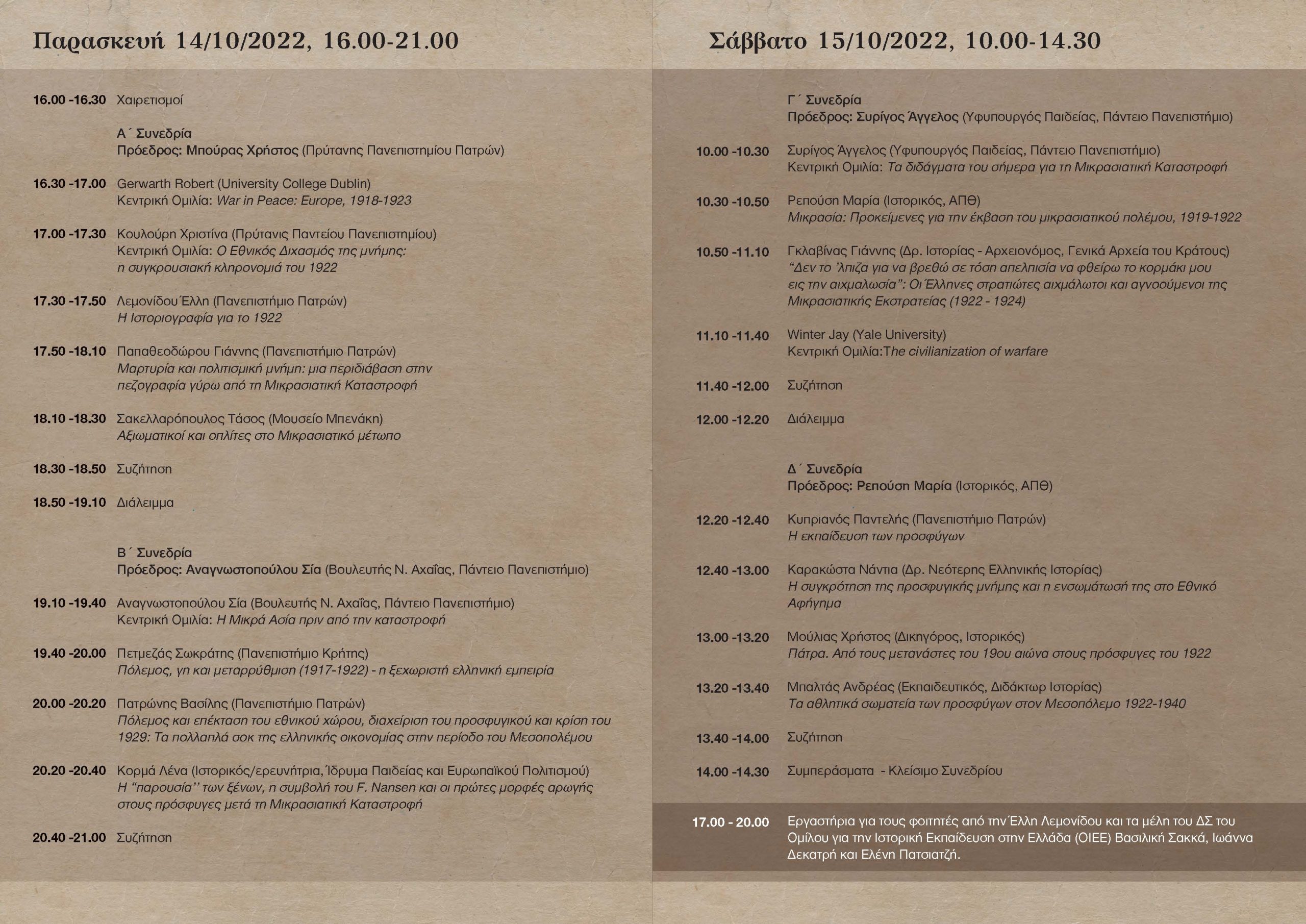 Με την ευκαιρία της συμπλήρωσης 100 ετών από τη Μικρασιατική Καταστροφή, το Πανεπιστήμιο Πατρών διοργανώνει διήμερο διεθνές επιστημονικό συνέδριο, με στόχο την ανάδειξη γνωστών και άγνωστων πτυχών ενός από τα πλέον τραυματικά ορόσημα στην ελληνική ιστορία του 20ού αιώνα και την εξοικείωση του κοινού της περιοχής με τις πλέον σύγχρονες επιστημονικές προσεγγίσεις για το γεγονός αυτό, που εξακολουθεί να έχει βαρύνουσα θέση και σημασία στη συλλογική μνήμη των Ελλήνων.