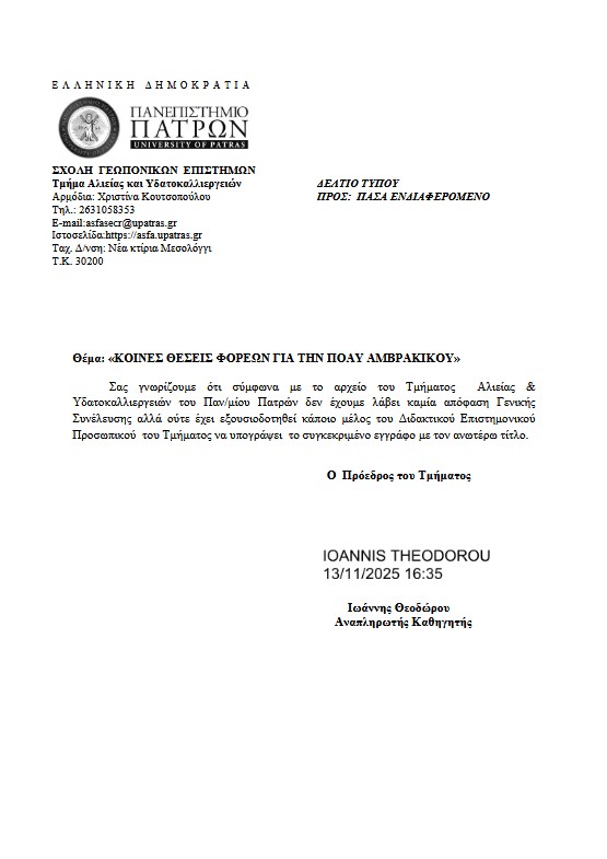 Τμήμα Αλιείας και Υδατοκαλλιεργειών Πανεπιστημίου Πατρών | Κοινές θέσεις φορέων για την ΠΟΑΥ Αμβρακικού