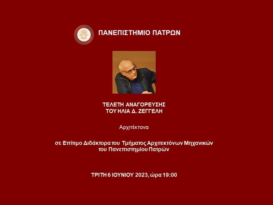 O Αρχιτέκτονας, Ηλίας Δ. Ζέγγελης,  θα αναγορευθεί Επίτιμος Διδάκτορας του Τμήματος Αρχιτεκτόνων Μηχανικών, την Τρίτη 6 Ιουνίου 2023 και ώρα 19:00 στην Αίθουσα Τελετών του Πανεπιστημίου Πατρών. Το έργο και την προσωπικότητα του τιμώμενου θα παρουσιάσει ο Πρόεδρος του Τμήματος, Καθηγητής Ιωάννης Αίσωπος ενώ θα ακολουθήσει η αναγόρευση του τιμώμενου σε Επίτιμο Διδάκτορα από τον Πρόεδρο του Τμήματος Αρχιτεκτόνων Μηχανικών, Καθηγητή Ιωάννη Αίσωπο και η περιένδυσή του από τον Πρύτανη του Πανεπιστημίου, Καθηγητή Χρήστο Μπούρα. Η εκδήλωση της επιτιμοποίησης θα ολοκληρωθεί με την ομιλία του τιμώμενου με τίτλο: «Έξοδος ή Οι Εθελοντές Δεσμώτες της Αρχιτεκτονικής»