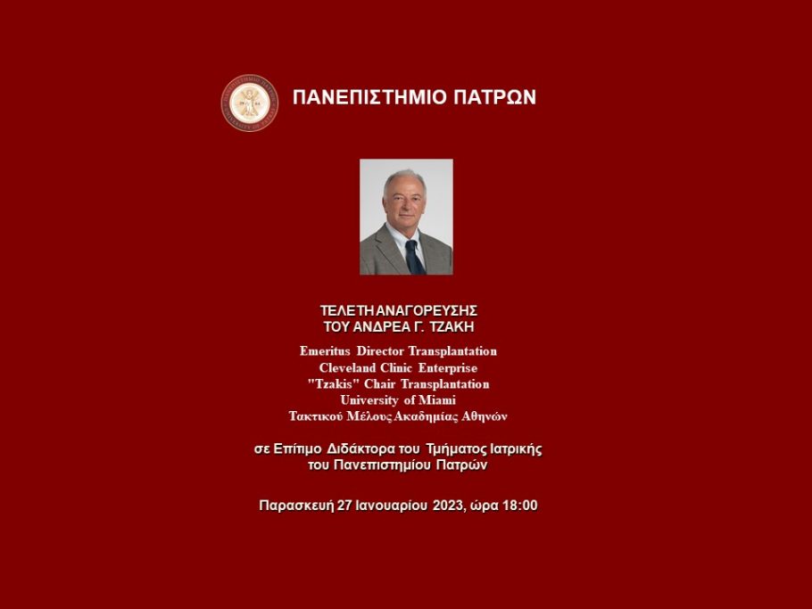 O Ανδρέας Γ. Τζάκης, Emeritus Director Transplantation Cleveland Clinic Enterprise, “Tzakis” Chair Transplantation University of Miami, Τακτικό Μέλος Ακαδημίας Αθηνών θα αναγορευθεί Επίτιμος Διδάκτορας του Τμήματος Ιατρικής, την Παρασκευή 27 Ιανουαρίου 2023 και ώρα 18:00 στην Αίθουσα Τελετών του Πανεπιστημίου Πατρών. Το έργο και την προσωπικότητα του τιμώμενου θα παρουσιάσει ο Καθηγητής του Τμήματος Ιατρικής κ. Ιωάννης Μαρούλης ενώ θα ακολουθήσει η αναγόρευση του τιμώμενου σε Επίτιμο Διδάκτορα από τον Αναπληρωτή Πρόεδρο του Τμήματος Ιατρικής, Καθηγητή κ. Γεώργιο Καγκάδη και η περιένδυσή του από τον Πρύτανη του Πανεπιστημίου, Καθηγητή Χρήστο Μπούρα. Η εκδήλωση της επιτιμοποίησης θα ολοκληρωθεί με την ομιλία του τιμώμενου με τίτλο: «Προσωπική εμπειρία με τις μεταμοσχεύσεις μήτρας»