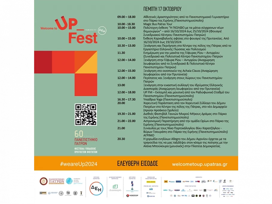 Όλες οι πληροφορίες για το Φεστιβάλ Υποδοχής Πρωτοετών Φοιτητών του Πανεπιστημίου Πατρών εδώ: https://welcometoup.upatras.edu.gr/