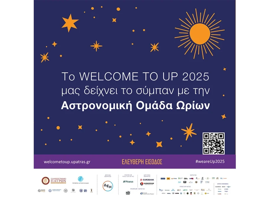 Η Αστρονομική Εταιρεία Πάτρας «Ωρίων» συμμετέχει και φέτος στο Φεστιβάλ καλωσορίσματος των πρωτοετών φοιτητών του Πανεπιστημίου Πατρών, Welcome to UP 2025 powered by ΔΕΗ, προσφέροντας μοναδικές εμπειρίες γνωριμίας με τον έναστρο ουρανό και τον Ήλιο.